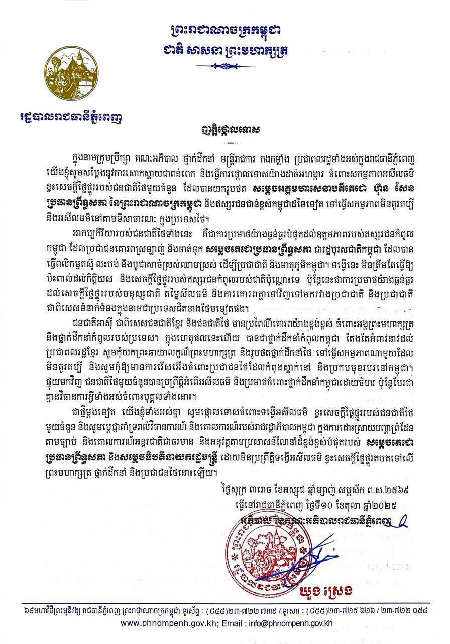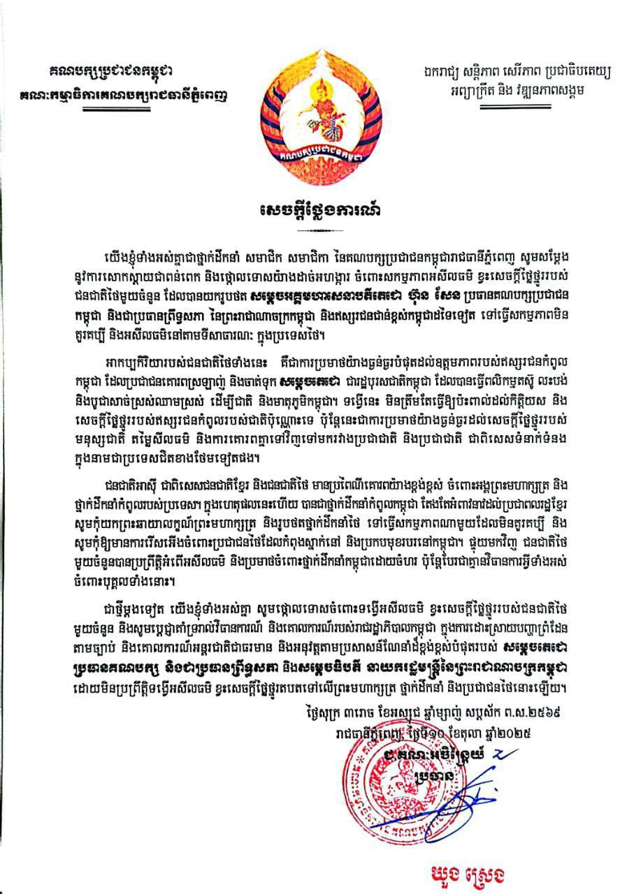 ញត្តិថ្កោលទោសរបស់ រដ្ឋបាលរាជធានីភ្នំពេញ និង គណៈកម្មាធិការគណបក្សប្រជាជនកម្ពុជារាជធានីភ្នំពេញ