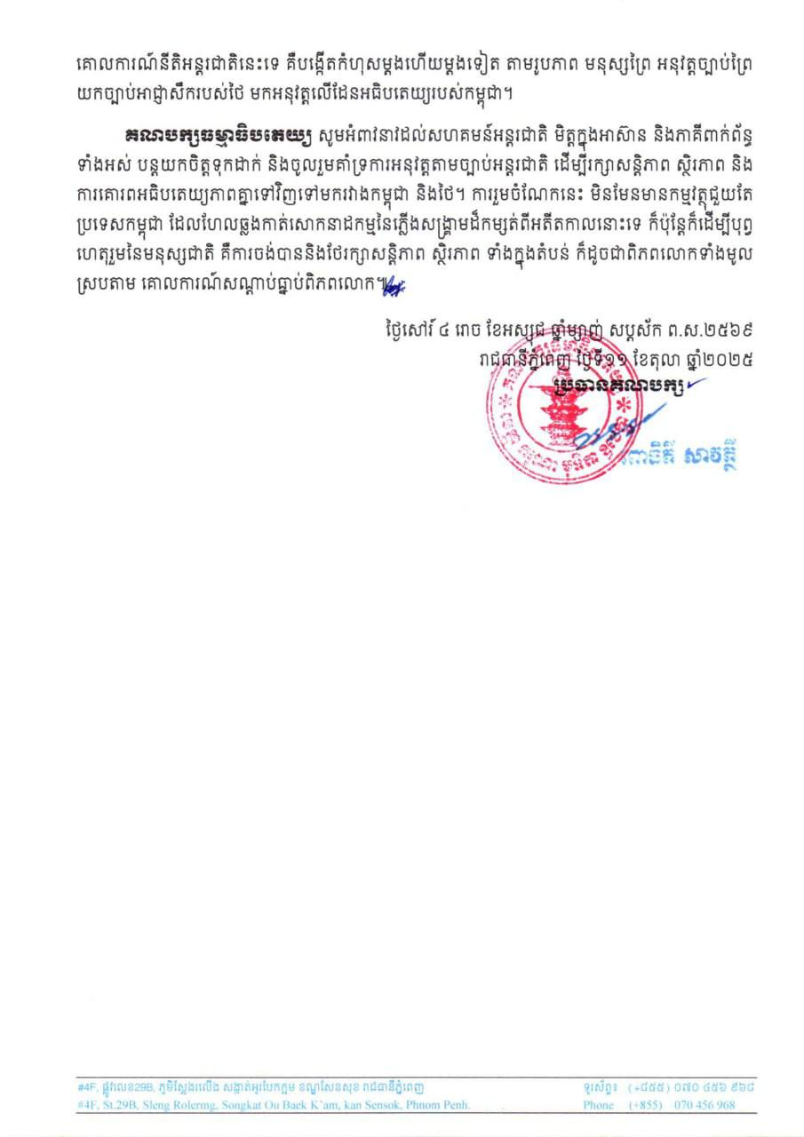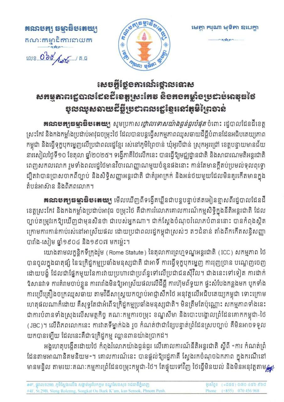 គណបក្សធម្មាធិបតេយ្យ ប្រកាសថ្កោលទោសយ៉ាងធ្ងន់ធ្ងរបំផុត ចំពោះរដ្ឋបាលដែនដីខេត្តស្រះកែវ និងកងកម្លាំងប្រដាប់អាវុធចម្រុះថៃ ដែលបានបន្តធ្វើសកម្មភាពឈូសឆាយដីធ្លីបំពានដែនអធិបតេយ្យភាពកម្ពុជា និងធ្វើទុក្ខបុកម្នេញលើប្រជាពលរដ្ឋខ្មែររស់នៅភូមិព្រៃចាន់ ឃុំអូរបីជាន់ ស្រុកអូរជ្រៅ ខេត្តបន្ទាយមានជ័យ នារសៀលថ្ងៃទី១០ ខែតុលា ឆ្នាំ២០២៥។