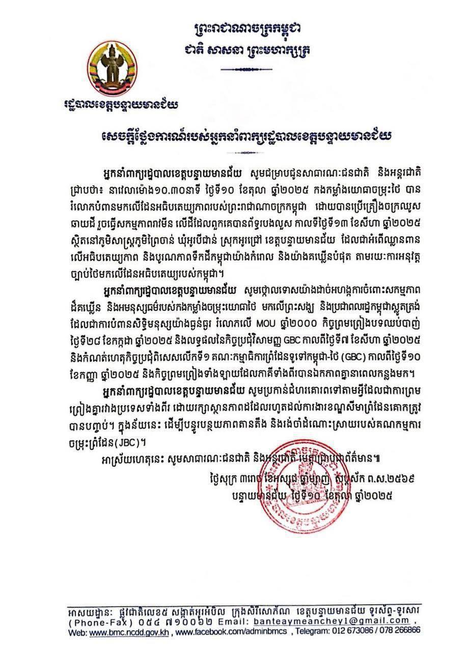 សេចក្តីថ្លែងការណ៍ របស់អ្នកនាំពាក្យរដ្ឋបាលខេត្តបន្ទាយមានជ័យ ពាក់ព័ន្ធកងកម្លាំងយោធាចម្រុះថៃ បានរំលោភបំពានមកលើដែនអធិបតេយ្យភាពរបស់ព្រះរាជាណាចក្រកម្ពុជា ដោយបានប្រើគ្រឿងចក្រឈូសឆាយដី រួចធ្វើសកម្មភាពរាវមីន លើដីដែលពួកគេបានព័ទ្ធរបងលួស កាលពីថ្ងៃទី១៣ ខែសីហា ឆ្នាំ២០២៥ ស្ថិតនៅភូមិសាស្ត្រភូមិព្រៃចាន់ ឃុំអូរបីជាន់ ស្រុកអូរជ្រៅ ខេត្តបន្ទាយមានជ័យ