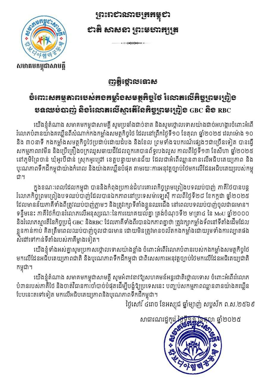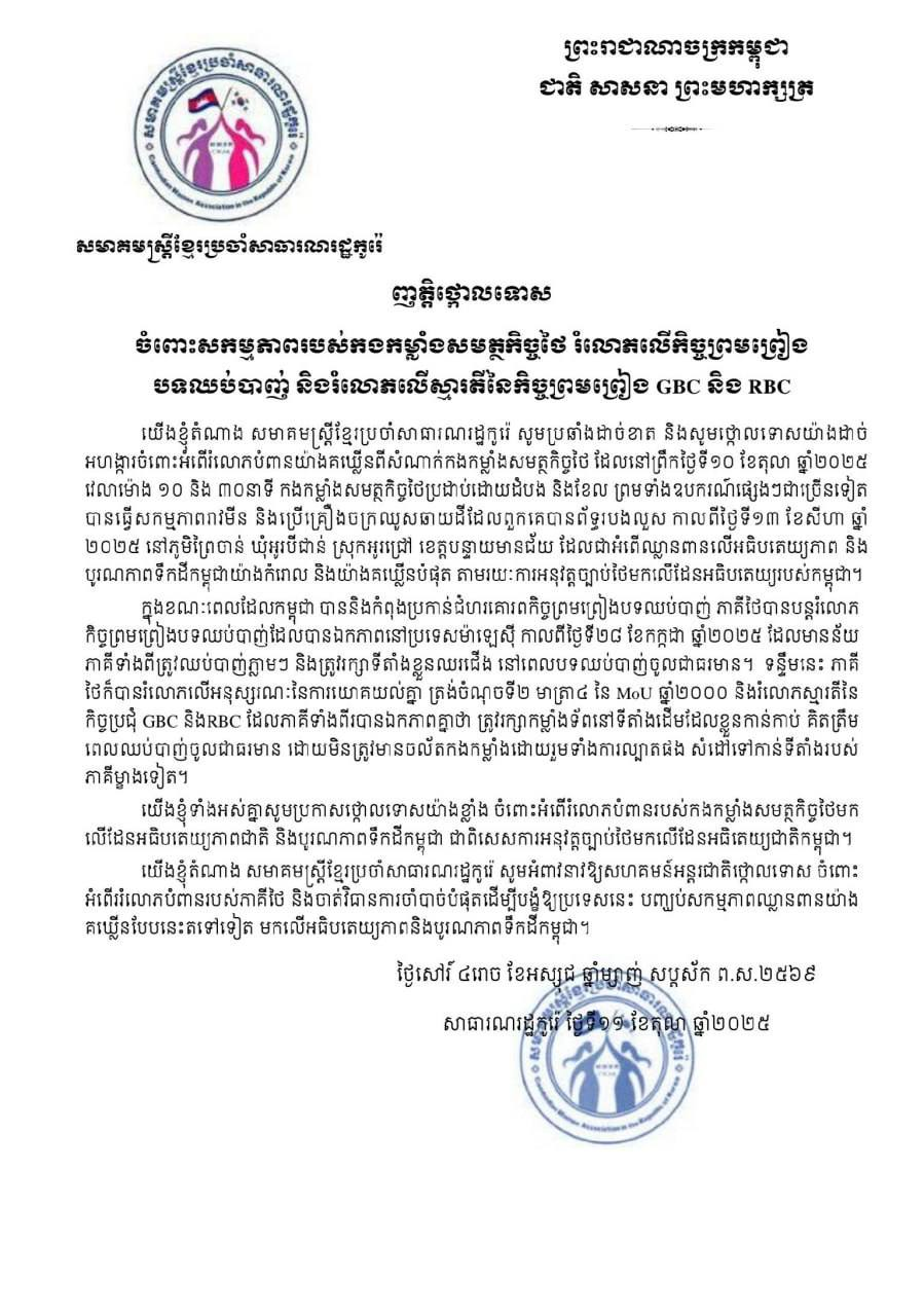 នៅក្នុងញត្តិថ្កោលទោសទាំងនោះ សមាគមទាំង ៦ បានសរសេរថា ក្នុងខណៈពេលដែលកម្ពុជា បាននិងកំពុងប្រកាន់ជំហរគោរពកិច្ចព្រមព្រៀងបទឈប់បាញ់ ភាគីថៃបានបន្តរំលោភកិច្ចព្រមព្រៀងបទឈប់បាញ់ដែលបានឯកភាពនៅប្រទេសម៉ាឡេស៊ី កាលពីថ្ងៃទី ២៨ ខែកក្កដា ឆ្នាំ ២០២៥ ដែលមានន័យថា ភាគីទាំងពីត្រូវឈប់បាញ់ភ្លាមៗ និងត្រូវរក្សាទីតាំងខ្លួនឈរជើង នៅពេលបទឈប់បាញ់ចូលជាធរមាន។