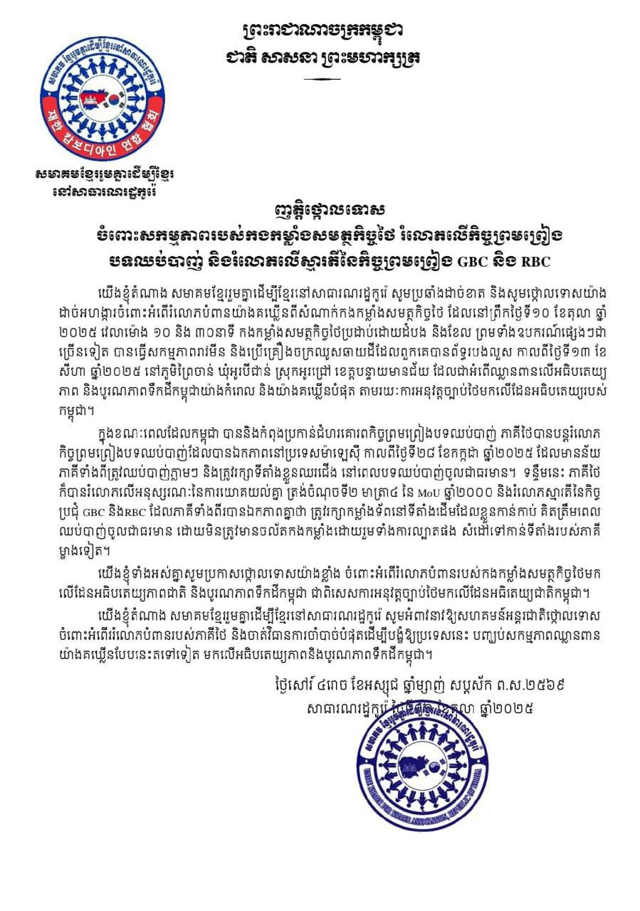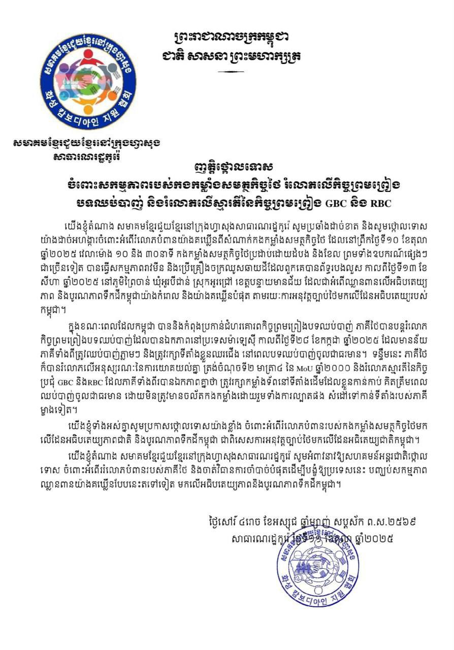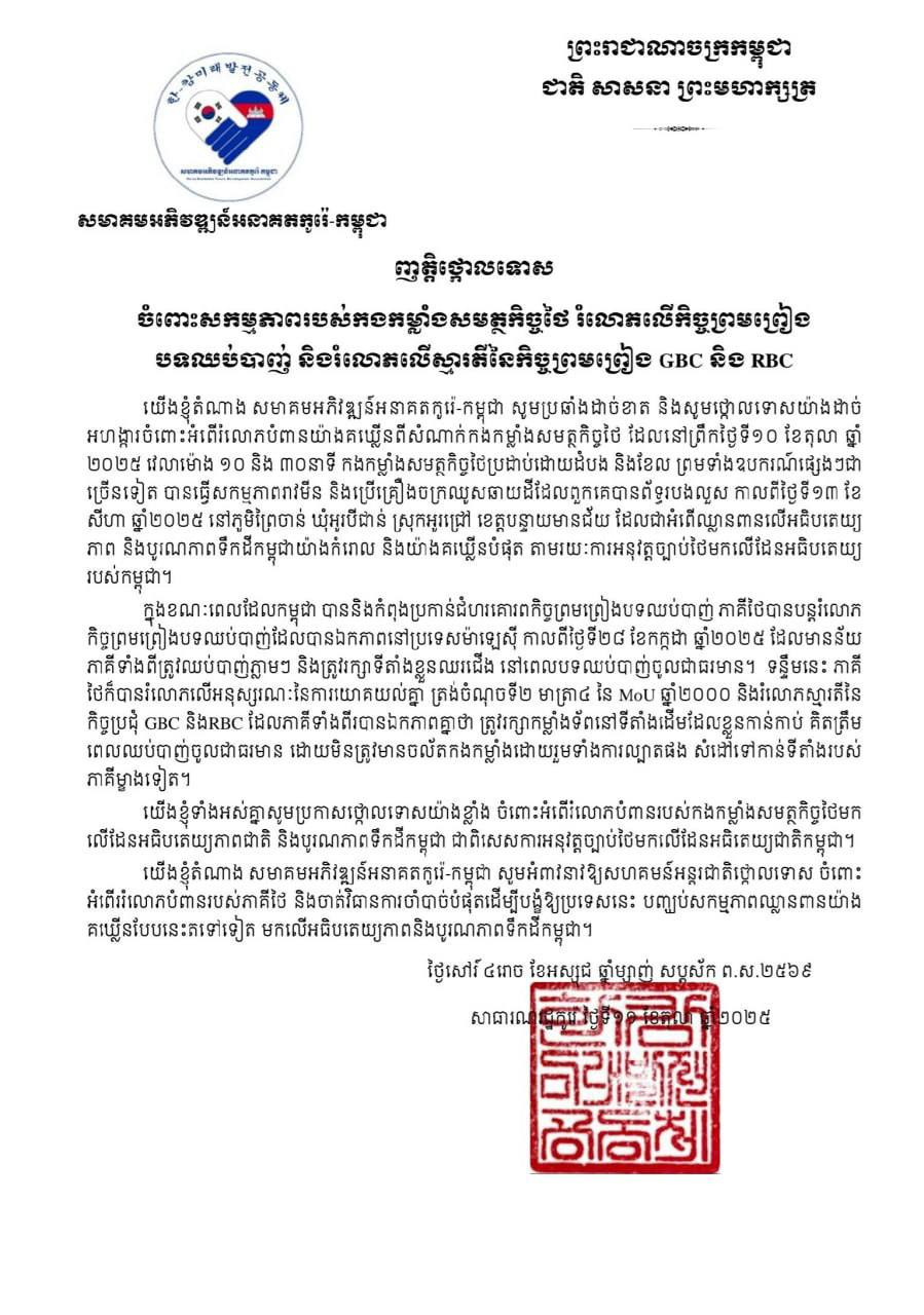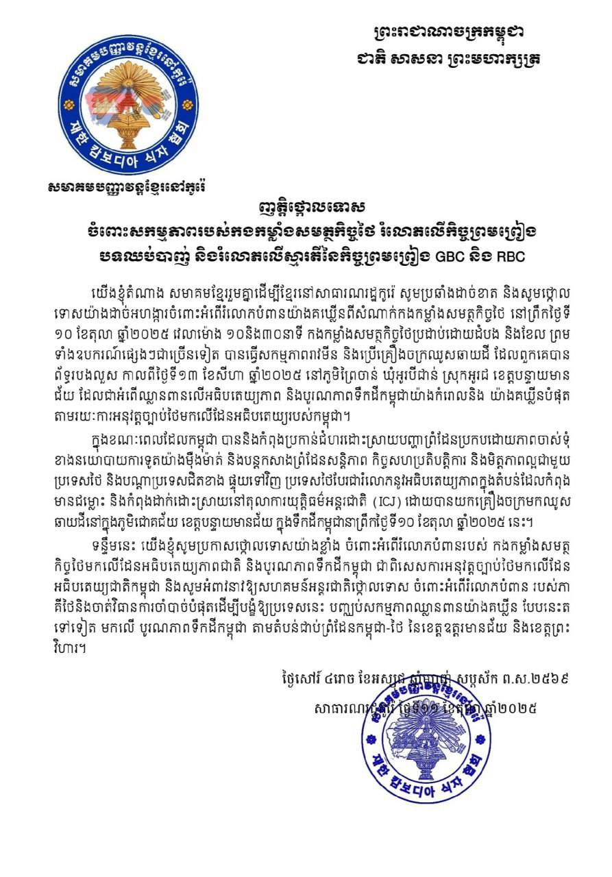 (ភ្នំពេញ)៖ សមាគមខ្មែរចំនួន ៦ ដែលមានមូលដ្ឋាននៅប្រទេសកូរ៉េខាងត្បូង នៅថ្ងៃទី ១១ ខែតុលា ឆ្នាំ ២០២៥នេះ បានចេញញត្តិដាច់ដោយឡែកពីគ្នា ដោយថ្កោលទោសចំពោះសកម្មភាពរបស់កងកម្លាំងសមត្ថកិច្ចថៃ ដែលបានរំលោភលើកិច្ចព្រមព្រៀងបទឈប់បាញ់ និងរំលោភលើស្មារតីនៃកិច្ចព្រមព្រៀង GBC និង RBC។