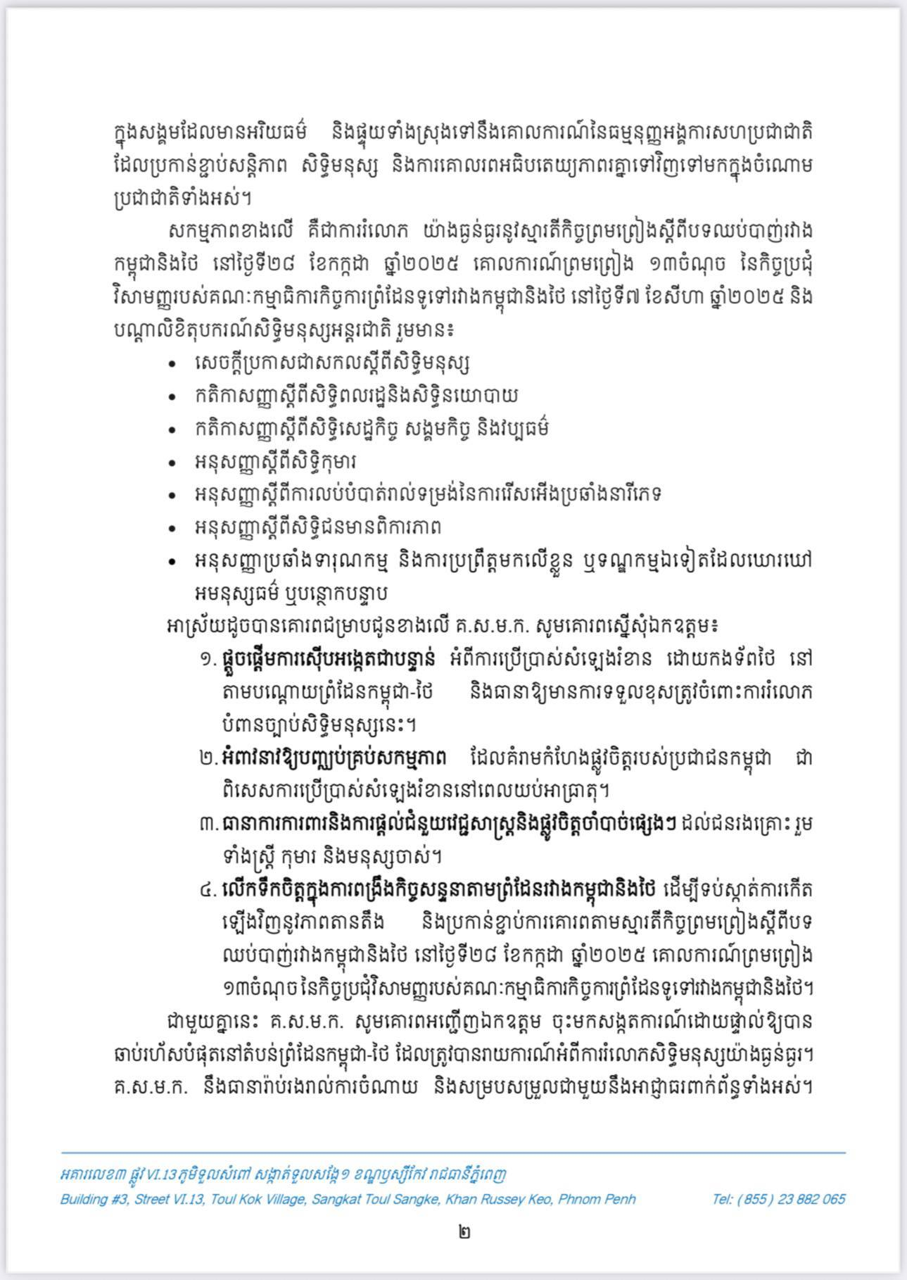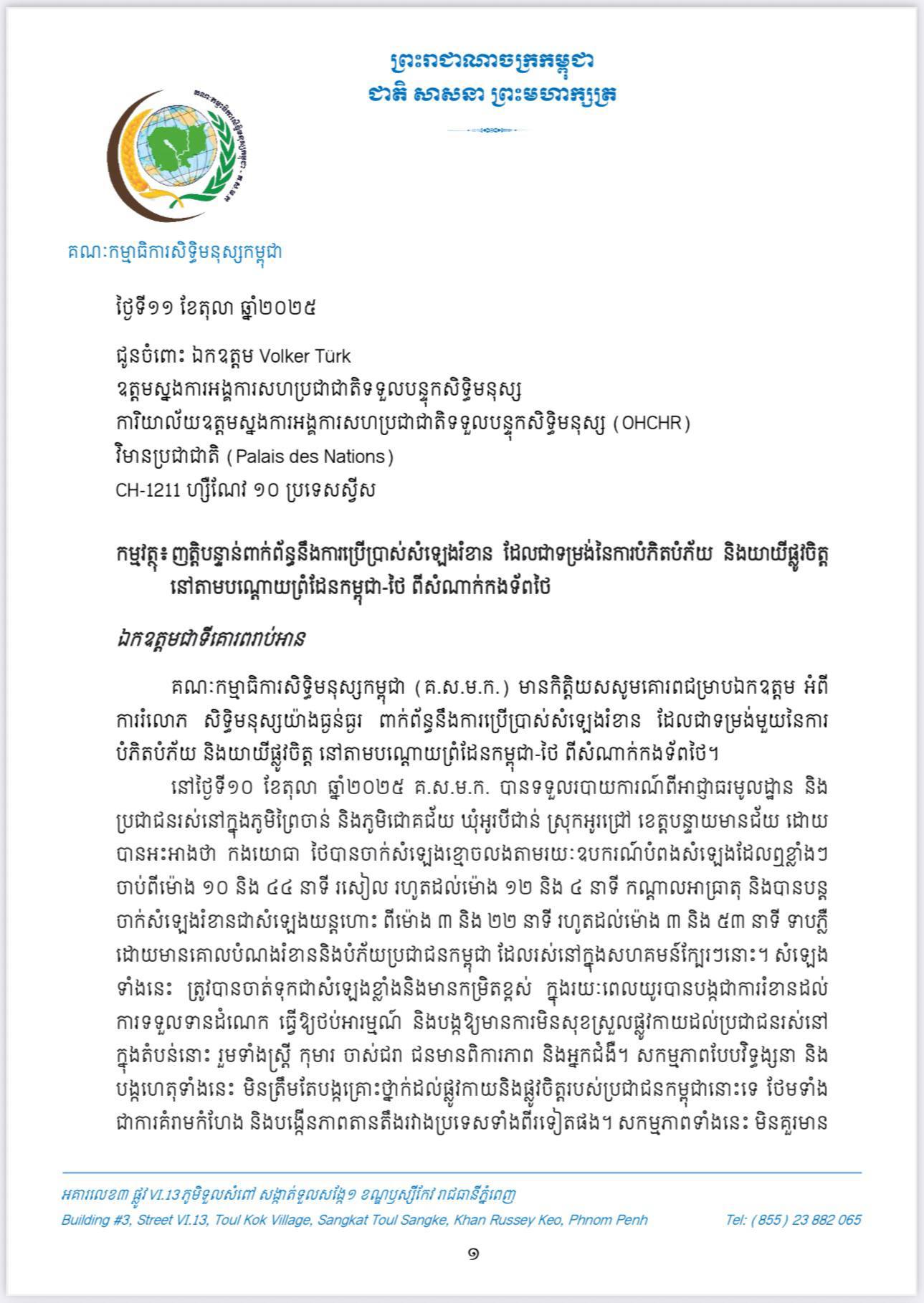 ប្រធានគណៈកម្មាធិការសិទ្ធិមនុស្សកម្ពុជា ផ្ញើញត្តិបន្ទាន់ជូន ឯកឧត្តម Volker Türk ឧត្តមស្នងការអង្គការសហប្រជាជាតិទទួលបន្ទុកសិទ្ធិមនុស្ស (OHCHR) ពាក់ព័ន្ធនឹងការប្រើប្រាស់សំឡេងរំខាន ដែលជាទម្រង់នៃការបំភិតបំភ័យ និងយាយីផ្លូវចិត្ត នៅតាមបណ្តោយព្រំដែនកម្ពុជា-ថៃ ពីសំណាក់កងទ័ពថៃ