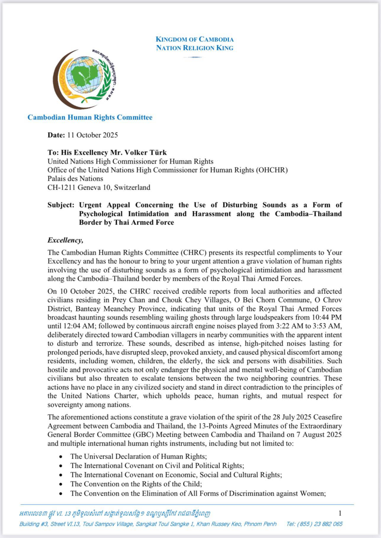 President of Cambodian Human Rights Committee Sends Urgent Appeal to His Excellency Mr. Volker Türk, United Nations High Commissioner for Human Rights (OHCHR) Concerning the Use of Disturbing Sounds as a Form of Psychological Intimidation and Harassment along the Cambodia-Thailand Border by Thai Armed Force