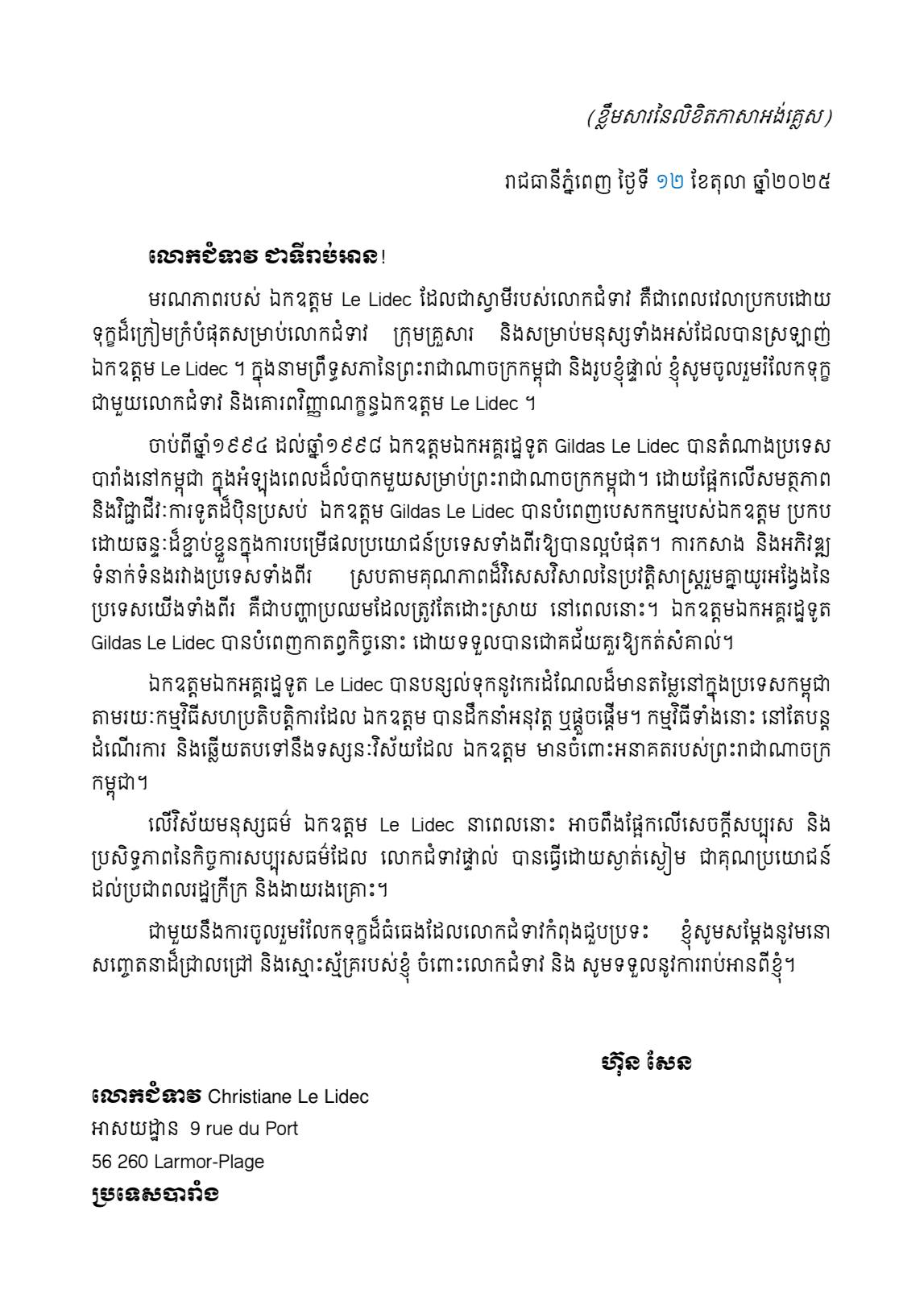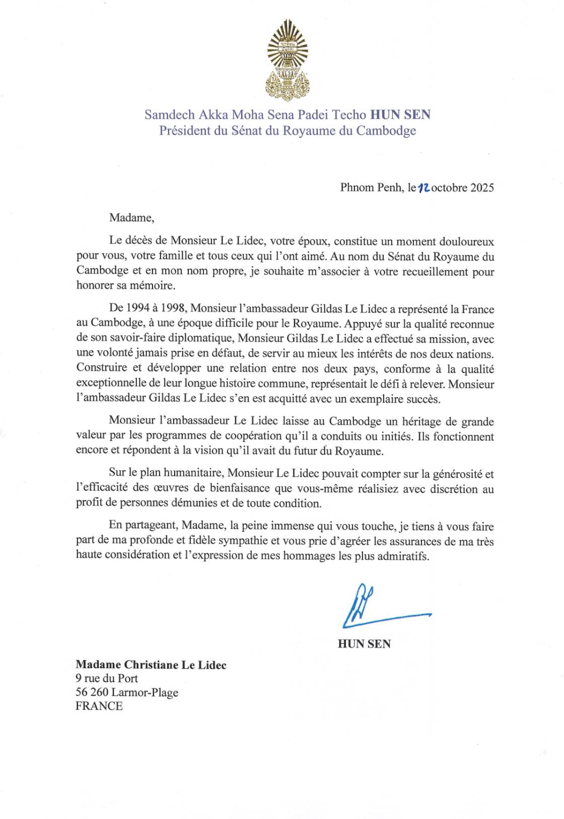 សម្តេចអគ្គមហាសេនាបតីតេជោ ហ៊ុន សែន ប្រធានព្រឹទ្ធសភានៃព្រះរាជាណាចក្រកម្ពុជា ផ្ញើសារលិខិតរំលែកទុក្ខជូន លោកជំទាវ Christiane Le Lidec ចំពោះមរណភាព ឯកឧត្តម Le Lidec អតីតឯកអគ្គរដ្ឋទូតនៃសាធារណរដ្ឋបារាំងប្រចាំកម្ពុជាពីឆ្នាំ១៩៩៤ ដល់ឆ្នាំ១៩៩៨