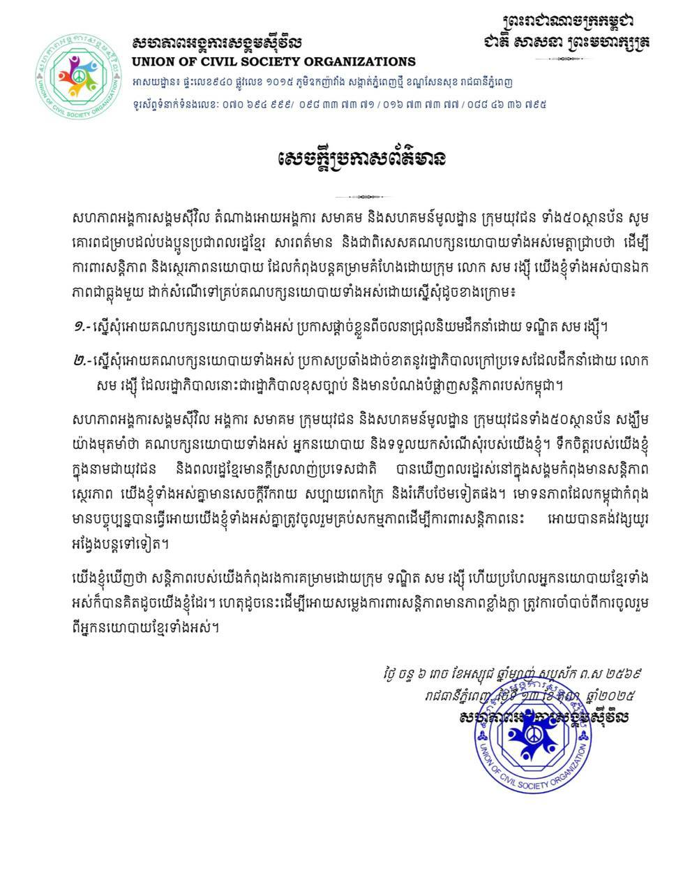 សហភាពអង្គការសង្គមស៊ីវិល តំណាងអោយអង្គការ សមាគម និងសហគមន៍មូលដ្ឋាន ក្រុមយុវជន ទាំង៥០ស្ថានប័ន សូមគោរពជម្រាបដល់បងប្អូនប្រជាពលរដ្ឋខ្មែរ សារពត៌មាន និងជាពិសេសគណបក្សនយោបាយទាំងអស់មេត្តាជ្រាបថា ដើម្បីការពារសន្តិភាព និងស្ថេរភាពនយោបាយ យើងខ្ញុំទាំងអស់បានឯកភាពជាធ្លុងមួយ ដាក់សំណើទៅគ្រប់គណបក្សនយោបាយទាំងអស់ដោយស្នើសុំដូចខាងក្រោម៖
