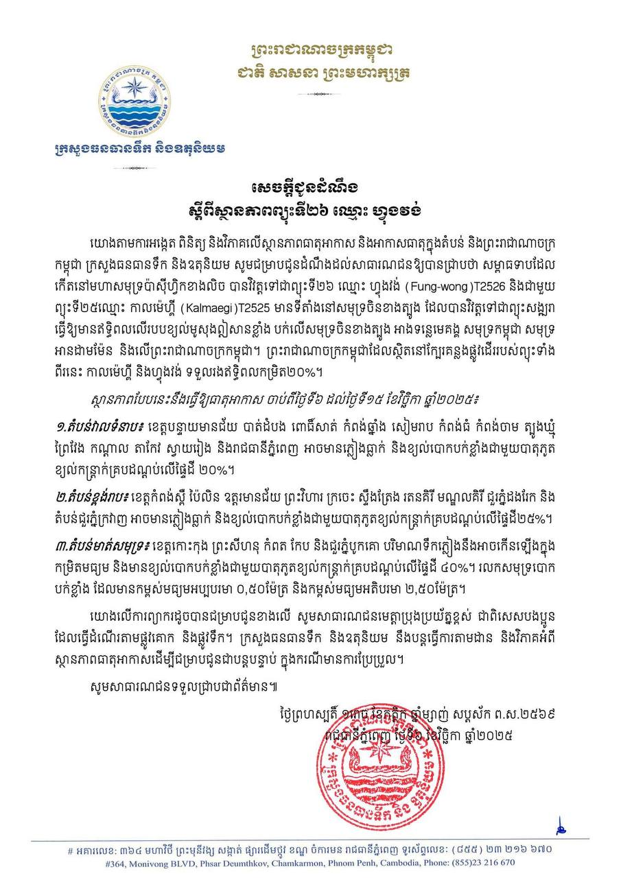 ក្រសួងធនធានទឹក និងឧតុនិយម សូមជម្រាបជូនដំណឹងដល់សាធារណជនឱ្យបានជ្រាបថា សម្ពាធទាបដែលកើតនៅមហាសមុទ្រប៉ាស៊ីហ្វិកខាងលិច បានវិវត្តទៅជាព្យុះទី២៦ ឈ្មោះ ហ្វុងវង់ (Fung-wong)T2526 និងជាមួយព្យុះទី២៥ឈ្មោះ កាលម៉េហ្គី (Kalmaegi)T2525។ ព្រះរាជាណាចក្រកម្ពុជាដែលស្ថិតនៅក្បែរគន្លងផ្លូវដើររបស់ព្យុះទាំងពីរនេះ កាលម៉េហ្គី និងហ្វុងវង់ ទទួលរងឥទ្ធិពលកម្រិត២០% ចន្លោះចាប់ពីថ្ងៃទី៦ ដល់ថ្ងៃទី១៥ ខែវិច្ឆិកា ឆ្នាំ២០២៥។