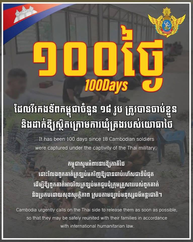 It has been 100 days since 18 Cambodian soldiers were captured under the captivity of the Thai military. Cambodia urgently calls on the Thai side to release them as soon as possible, so that they may be safely reunited with their families in accordance with international humanitarian law.