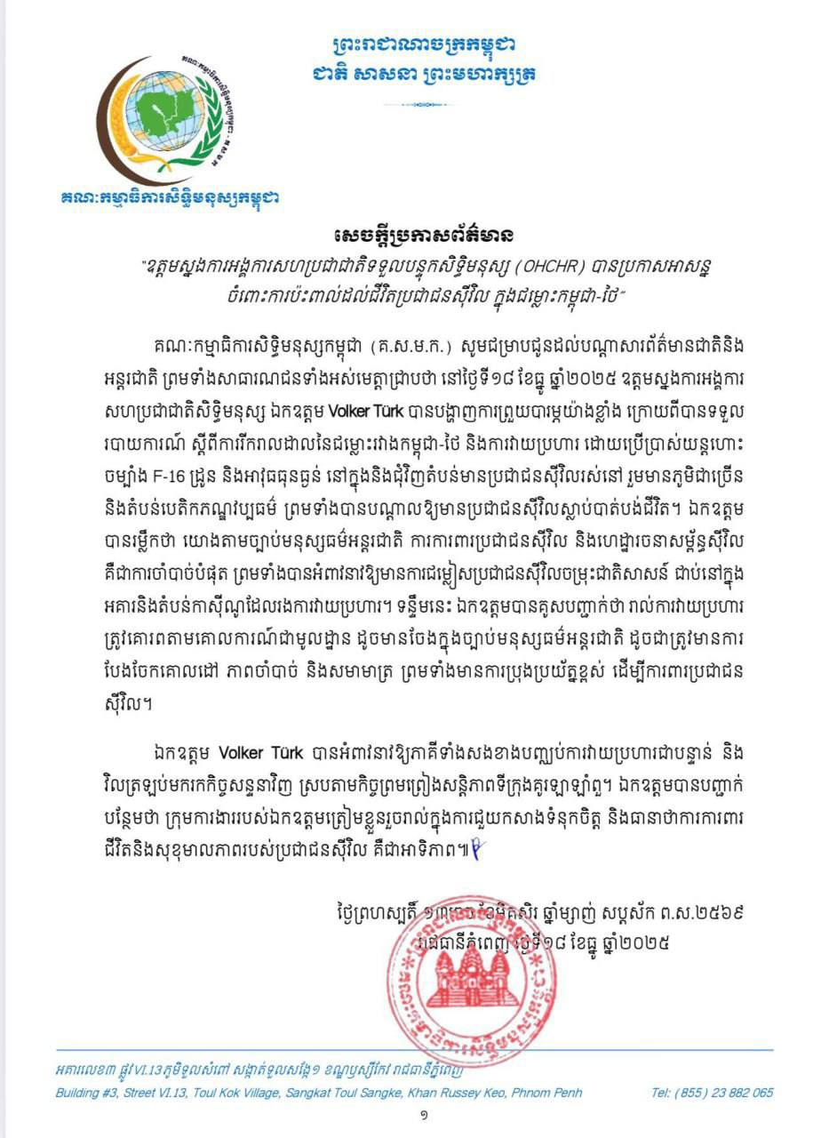 គណៈកម្មាធិការសិទ្ធិមនុស្សកម្ពុជា (គ.ស.ម.ក.) បានអោយដឹងថា នៅថ្ងៃទី១៨ ខែធ្នូ ឆ្នាំ២០២៥ ឧត្តមស្នងការអង្គការ សហប្រជាជាតិសិទ្ធិមនុស្ស ឯកឧត្តម Volker Türk បានបង្ហាញការព្រួយបារម្ភយ៉ាងខ្លាំង ក្រោយពីបានទទួល របាយការណ៍ ស្តីពីការរីករាលដាលនៃជម្លោះរវាងកម្ពុជា-ថៃ និងការវាយប្រហារ ដោយប្រើប្រាស់យន្តហោះ ចម្បាំង F-16 ជ្រួន និងអាវុធធុនធ្ងន់ នៅក្នុងនិងជុំវិញតំបន់មានប្រជាជនស៊ីវិលរស់នៅ រួមមានភូមិជាច្រើន និងតំបន់បេតិកភណ្ឌវប្បធម៌ ព្រមទាំងបានបណ្តាលឱ្យមានប្រជាជនស៊ីវិលស្លាប់បាត់បង់ជីវិត។ ឯកឧត្តម បានរម្លឹកថា យោងតាមច្បាប់មនុស្សធម៌អន្តរជាតិ ការការពារប្រជាជនស៊ីវិល និងហេដ្ឋារចនាសម្ព័ន្ធស៊ីវិល គឺជាការចាំបាច់បំផុត ព្រមទាំងបានអំពាវនាវឱ្យមានការជម្លៀសប្រជាជនស៊ីវិលចម្រុះជាតិសាសន៍ ជាប់នៅក្នុង អគារនិងតំបន់កាស៊ីណូដែលរងការវាយប្រហារ។ ទន្ទឹមនេះ ឯកឧត្តមបានគូសបញ្ជាក់ថា រាល់ការវាយប្រហារ ត្រូវគោរពតាមគោលការណ៍ជាមូលដ្ឋាន ដូចមានចែងក្នុងច្បាប់មនុស្សធម៌អន្តរជាតិ ដូចជាត្រូវមានការ បែងចែកគោលដៅ ភាពចាំបាច់ និងសមាមាត្រ ព្រមទាំងមានការប្រុងប្រយ័ត្នខ្ពស់ ដើម្បីការពារប្រជាជន ស៊ីវិល។
